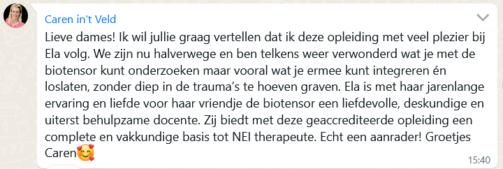 Ela is met haar jarenlange ervaring en liefde voor haar vriendje de biotensor een liefdevolle, deskundige en uiterst behulpzame docente.